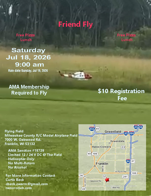 - Sat Jul 18 (rain Jul 19) – Rainbow Aero Modelers Society (RAMS) – SWARM Helicopter Friend Fly